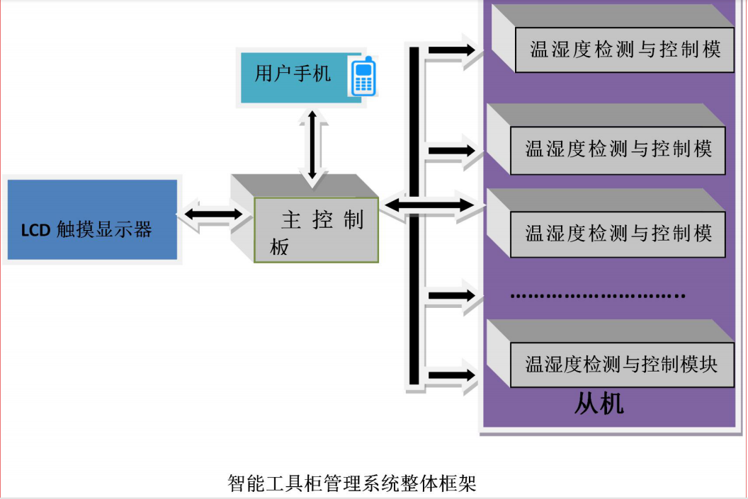 智能工具柜管理系統(tǒng)由 LCD 觸摸顯示屏、主控制板,多個從機(jī)模塊(溫濕度采集控制及工具位置信號采集)組成,具有以下功能特點(diǎn):