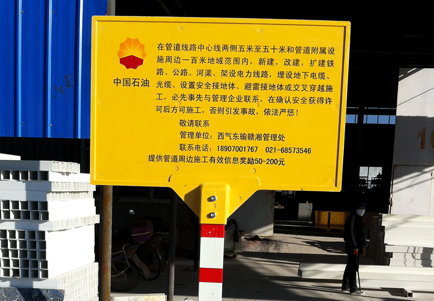 上圖為金能電力設(shè)備有限公司專門為中國石油天然氣股份有限公司西氣東輸工程制作的復合材料標志牌。