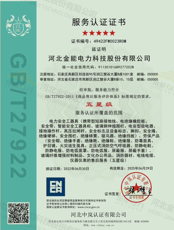 金能電力榮獲五星級(jí)服務(wù)認(rèn)證證書(shū)